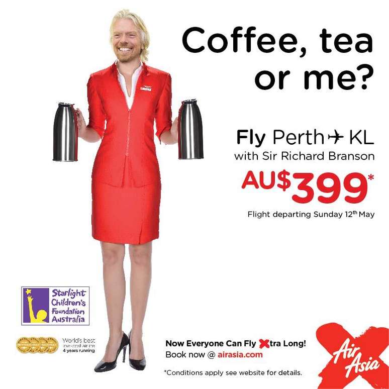 O britânico Branson havia feito uma aposta com seu ex-funcionário, o malaio Tony Fernandes, co-fundador e atual diretor da AirAsia e fundador da equipe Caterham, relativa à temporada 2010 da F1. O proprietário do time com resultados piores naquele campeonato (na comparação entre Virgin e Team Lotus, nome da Caterham na época) deveria se vestir de aeromoça por um dia.