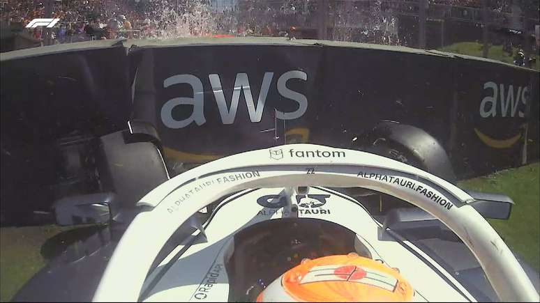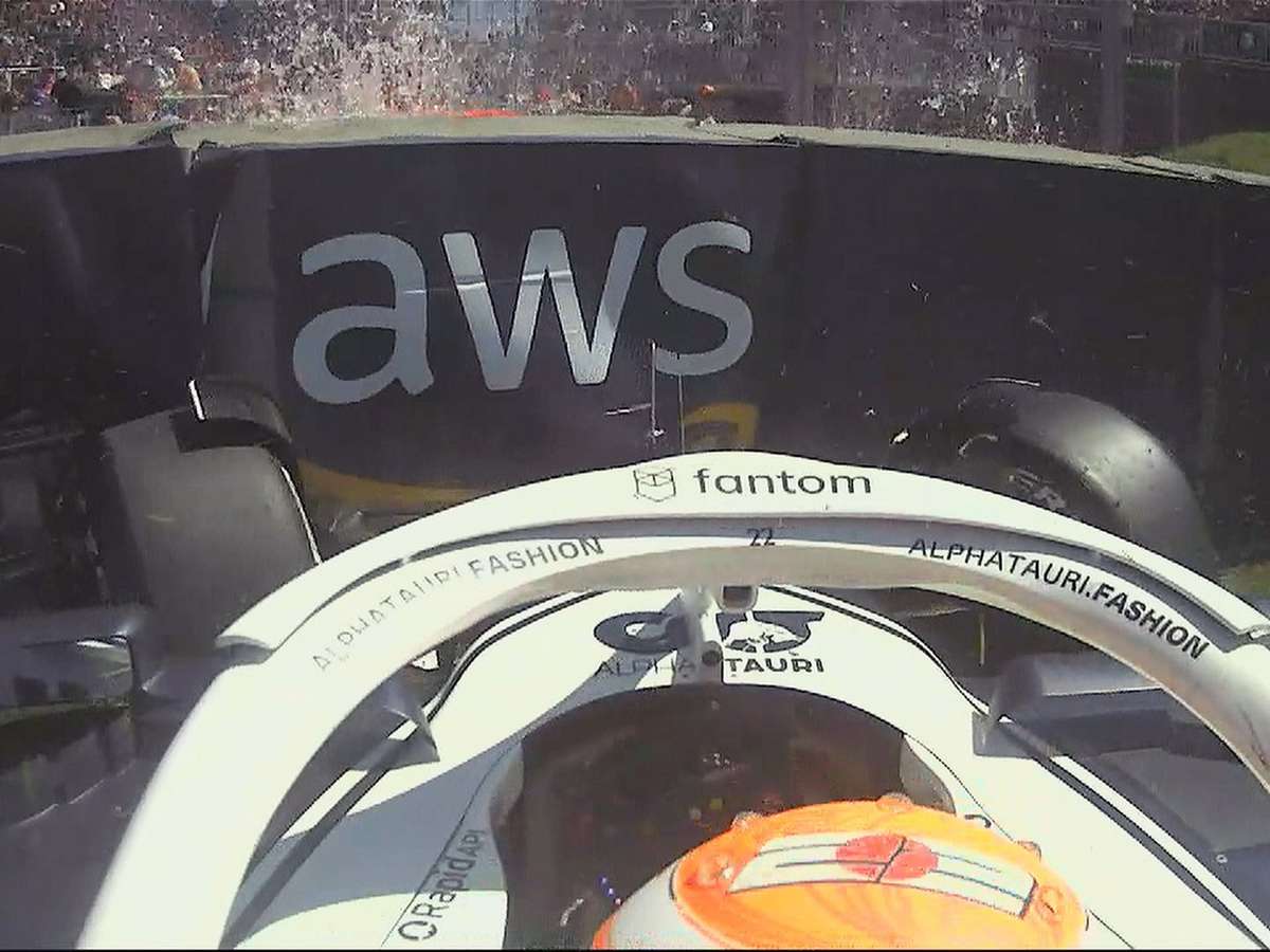 Yuki Tsunoda tentou fazer a curva na saída dos boxes, mas perdeu o controle do carro, passou reto e foi parar no muro durante o GP do Canadá, provocando a entrada do safety-car