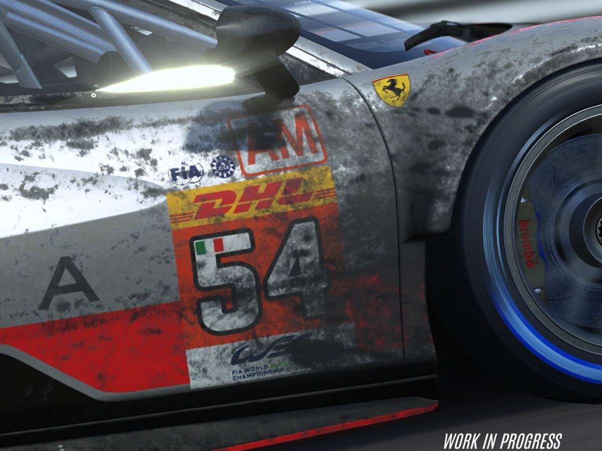 Nas imagens, aparece a Ferrari #54 da equipe AF Corse, que venceu na classe GTE-Am no último final de semana em Fuji. No detalhe, é possível ver que o carro está sujo, sinal de que a skin do modelo poderá mudar durante uma corrida.