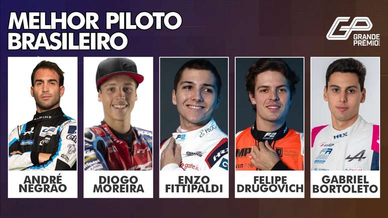 Na categoria de melhor piloto brasileiro de 2022, os indicados são Felipe Drugovich, campeão da Fórmula 2, Enzo Fittipaldi, que também se destacou na Fórmula 2, André Negrão, vice-campeão do Mundial de Endurance com a Alpine, Diogo Moreira, novato do ano na Moto 3, e Gabriel Bortoleto, com duas vitórias na FRECA neste ano. Vote nesta e em todas as outras categorias no espaço abaixo ou clicando no link.