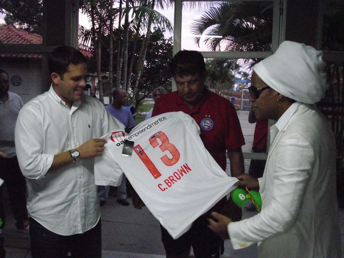 O elenco do Bahia recebeu nesta sexta-feira a visita do músico Carlinhos Brown. Torcedor do clube tricolor, Brown foi recebido pelo presidente Marcelo Guimarães Filhos e pelo técnico Joel Santana.