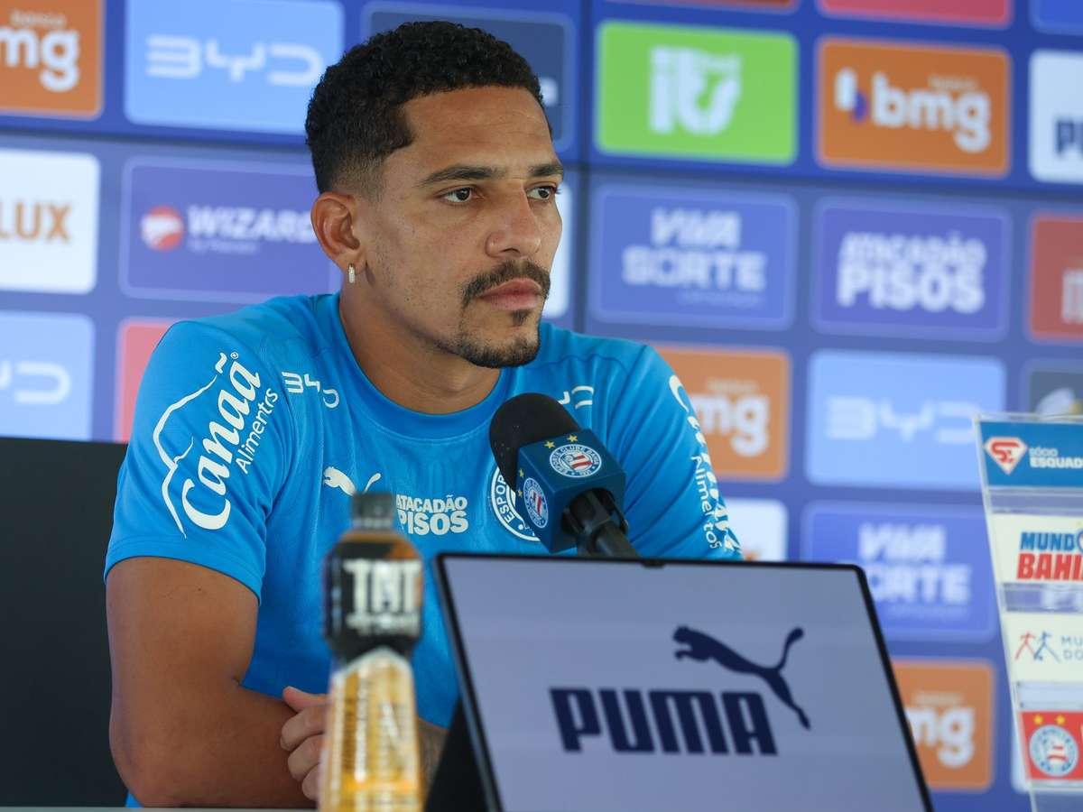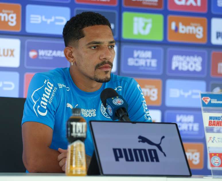 Gilberto, lateral do Bahia, concedeu entrevista coletiva no Centro de Treinamento Evaristo de Macedo, nesta quinta-feira (16).