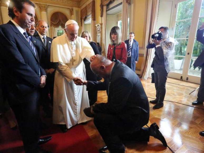 Antes de ir para a comunidade de Varginha, em Manguinhos, o Papa visitou o Palácio da Cidade, onde foi recebido por autoridades e atletas. O ex-jogador de basquete, Oscar Schmidt se ajoelhou diante do Pontífice