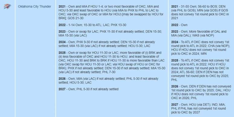 Para o Draft deste ano, o Thunder terá duas escolhas de primeira rodada: a própria e a do Miami Heat (isso se o Rockets tiver uma das quatro primeiras escolhas). Caso contrário, a pick do time texano vai para Oklahoma City e a do Heat para o Rockets. Ou seja, pelo menos uma escolha de loteria está assegurada. Além disso, o Thunder terá três picks de segunda rodada.