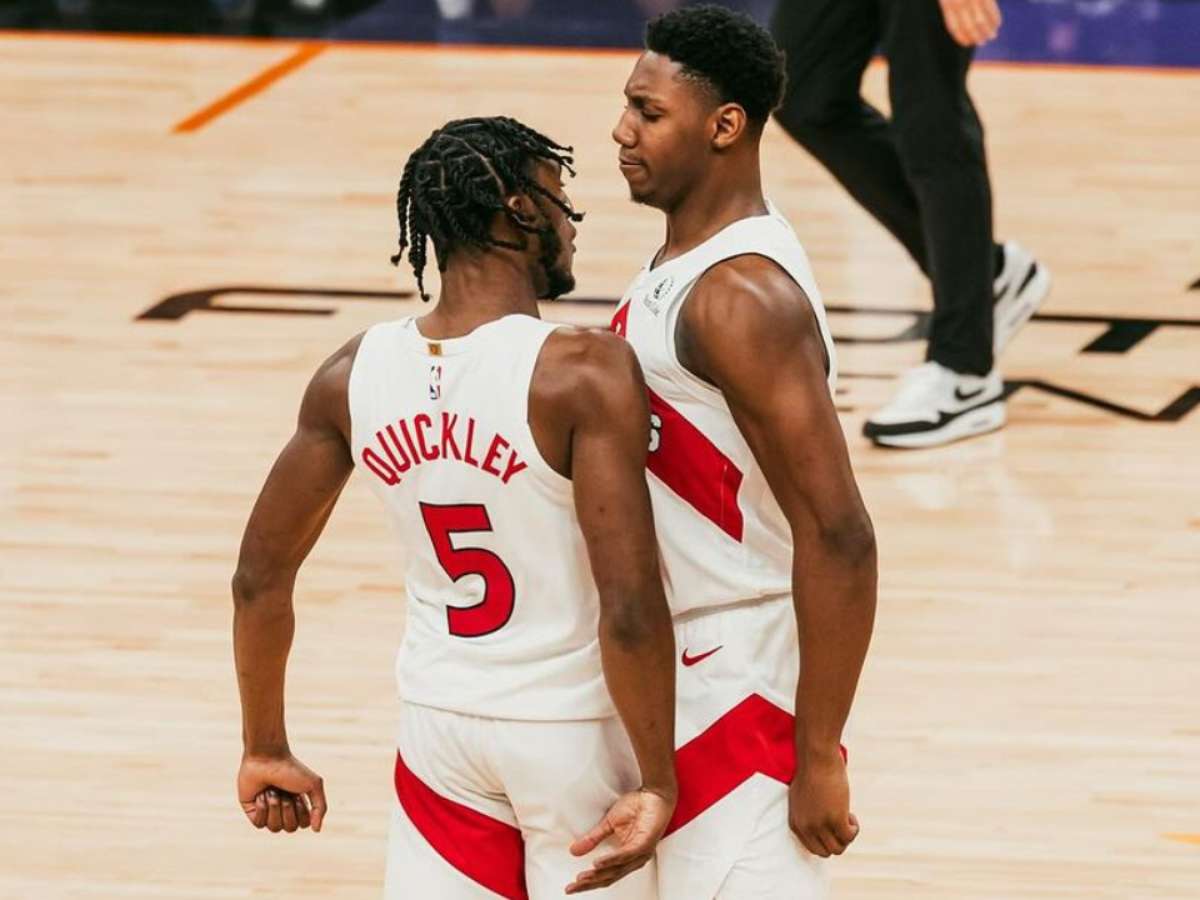Provável quinteto do Toronto Raptors: Immanuel Quickley, Gary Trent Jr., RJ Barrett, Ochai Agbaji e Kelly Oklynyk.