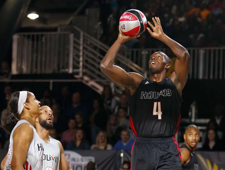 Bruce Bowen passa pelo ícone Dikembe Mutombo durante vitória da equipe comandada por James Hardem sobre o time de Russell Westbrook