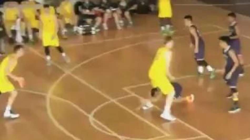 Em duelo por competição sub-19 na Oceania, jogador de Guam utiliza da baixa estatura para passar por baixo de rival da Austrália, mas não impede derrota por 103 a 40. Imagens: Fiba