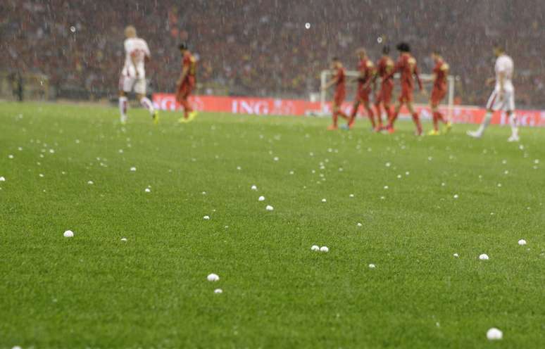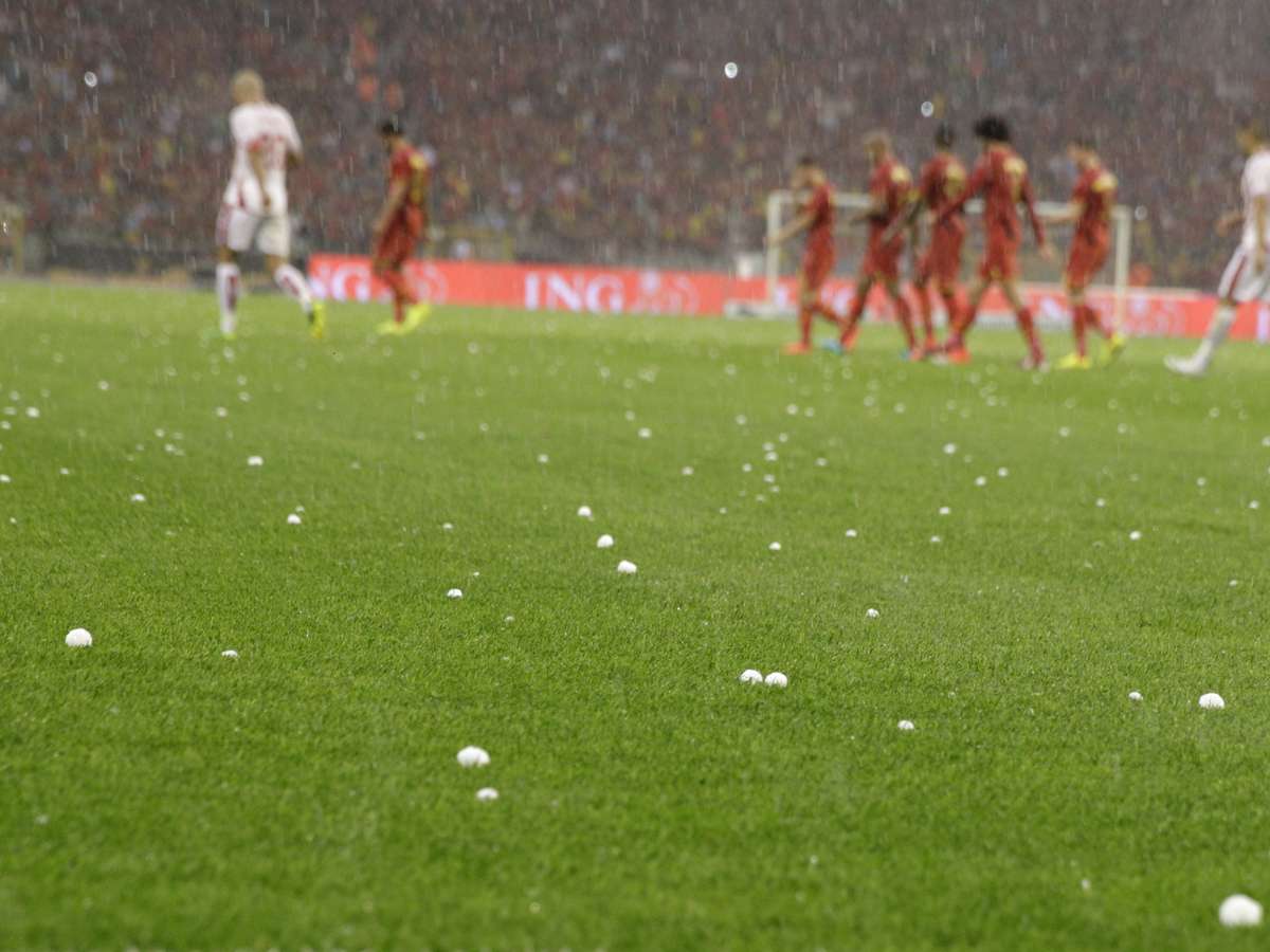Três dias antes de embarcar para o Brasil, a Bélgica realizou neste sábado o último amistoso antes da Copa do Mundo diante da Tunísia; a partida foi interrompida aos 24min do primeiro tempo por causa da chuva de granizo; partida foi retomada 40 minutos depois e foi vencida pelos belgas por 1 a 0