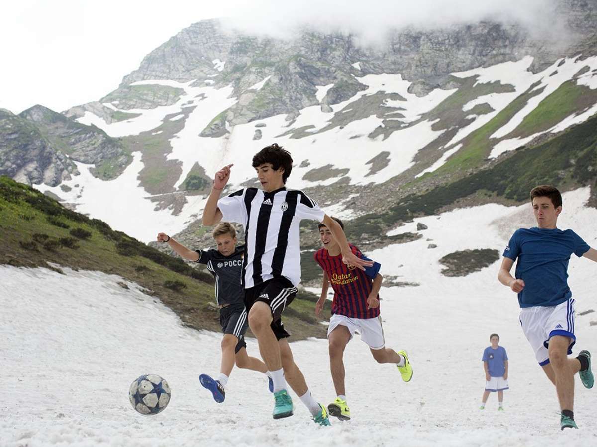 Boleiros de Sochi se divertem entre tombos e escorregões jogando sobre a neve compacta do glaciar Krasnaya Poliana. Espremida entre os picos nevados do Cáucaso e o Mar Negro, a geografia da cidade permite disputar uma partida sobre a neve num dia, e em seguida, jogar outra na praia