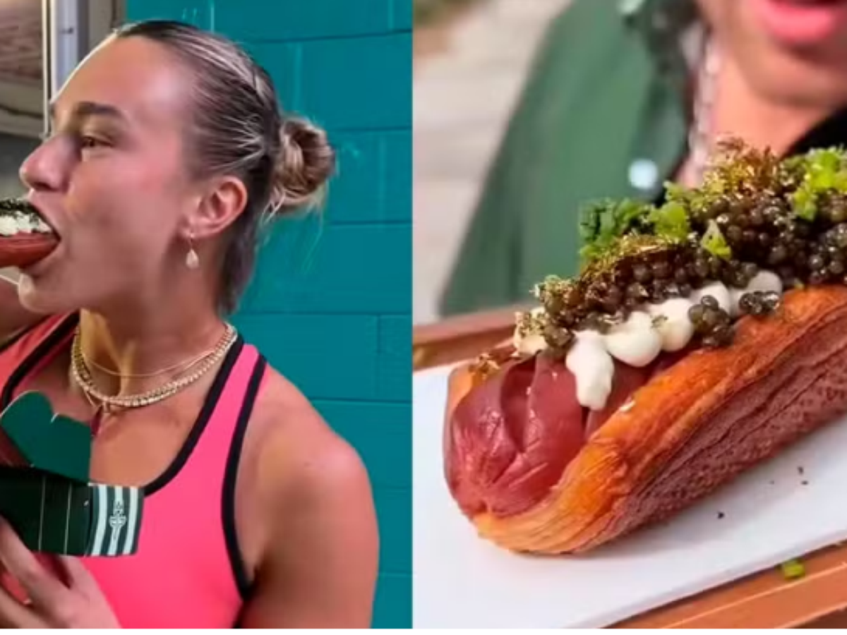 Aryna Sabalenka, após vencer no Miami Open, experimentou um hot dog de R$526 com wagyu, caviar e flocos de ouro, elogiando a iguaria em uma reação descontraída.