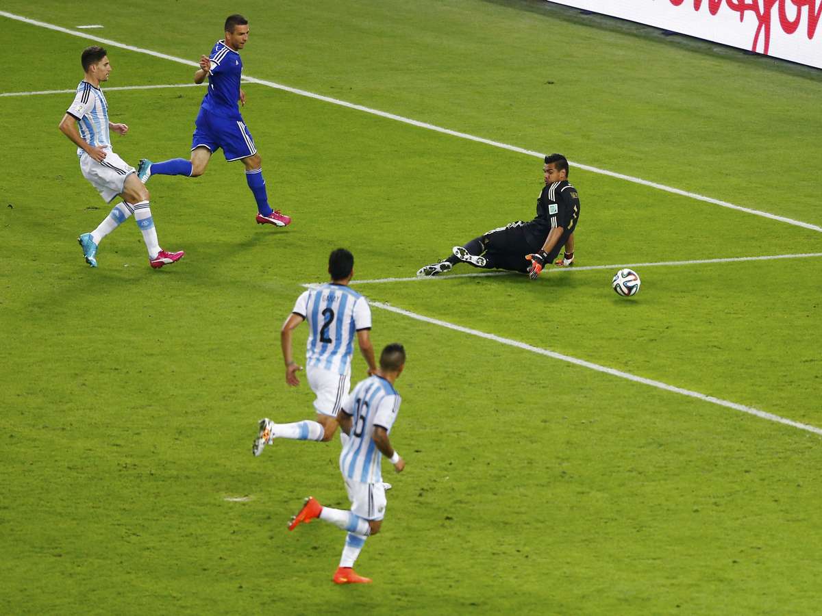 Messi carrega pelo meio, dribla Bicakcic e chuta forte da entrada da área, marcando o segundo gol da Argentina e garantindo a vitória da seleção sul-americana sobre a Bósnia por 2 a 1 na estreia na Copa do Mundo no Maracanã.