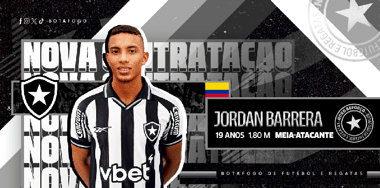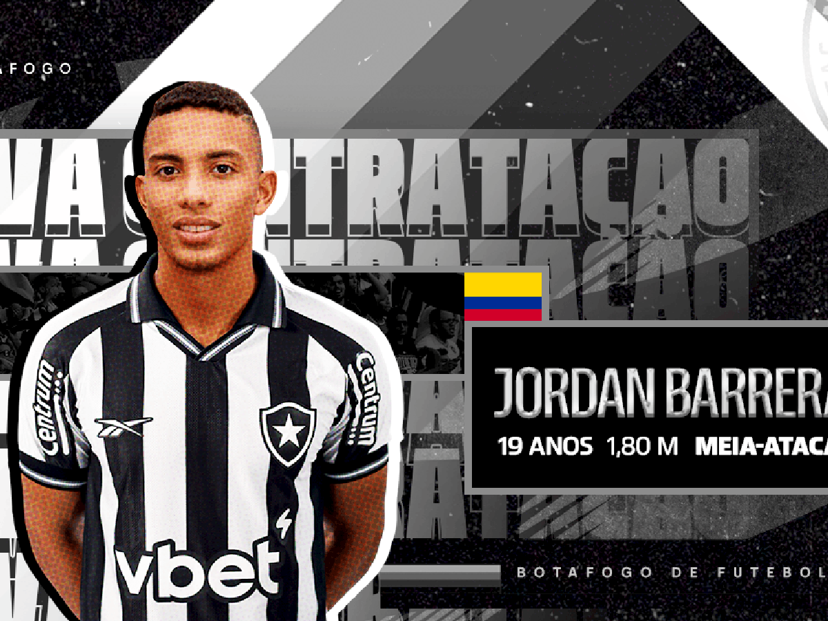 O Botafogo anunciou a contratação do meia-atacante colombiano Jordan Barrera, de 19 anos, que estava no Junior Barranquilla. Na negociação, o Alvinegro acordou pagar US$ 4 milhões (R$ 22,2 milhões, na cotação atual) para comprar 90% de seus direitos. Ele assinou um vínculo válido por quatro temporadas, indo até 2029.