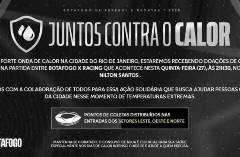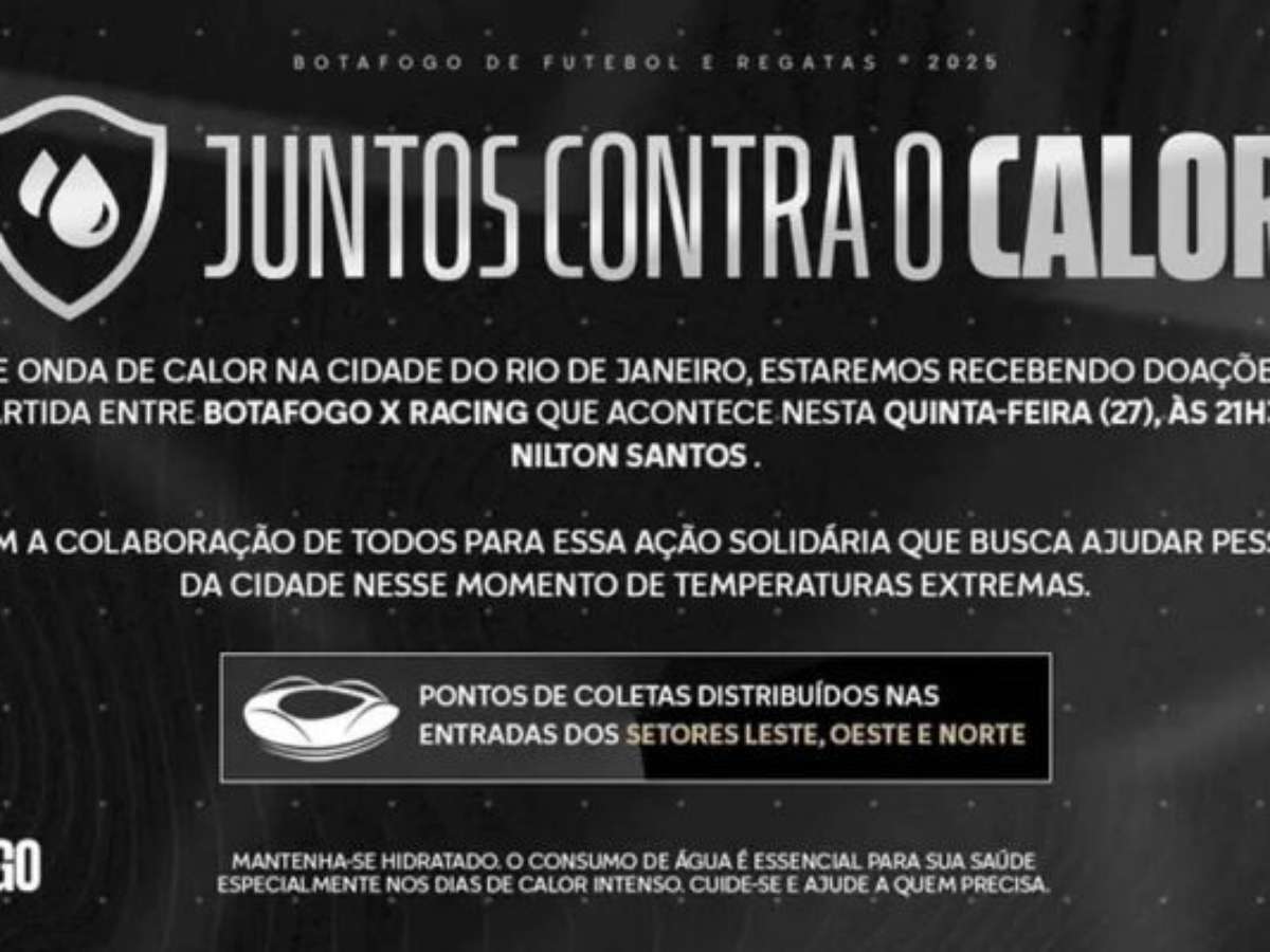Nesta quinta-feira (27), o Botafogo entra em campo pela partida de volta da Recopa contra o Racing. O jogo será no Estádio Nilton Santos, às 21h30 (de Brasília). Diante da onda de calor no Rio de Janeiro, o clube tomou medidas e organizará uma campanha de doações.