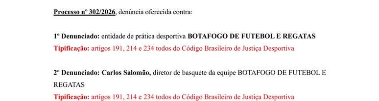 A denúncia teve como base três artigos do Código Brasileiro de Justiça Desportiva: o artigo 214, que trata da escalação de atleta em situação irregular; o artigo 234, referente à falsificação de documentos ou inserção de declarações falsas perante a Justiça Desportiva; e o artigo 191, que aborda o descumprimento de regulamento ou decisão da entidade.