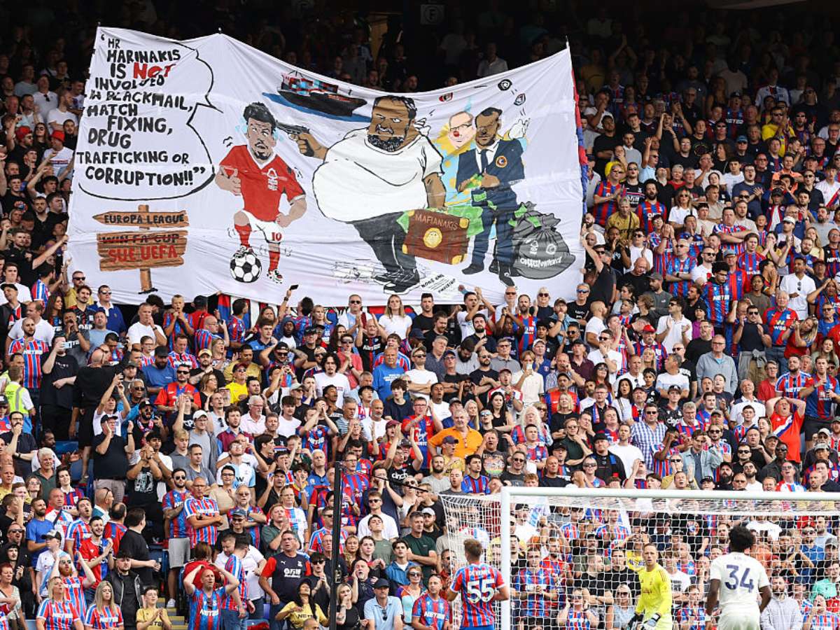 John Textor, dono da SAF do Botafogo, foi retratado como palhaço em protesto de torcedores do Crystal Palace devido a polêmicas envolvendo a perda de vaga na Liga Europa e foi associado ao bilionário grego Evangelos Marinakis, também alvo das manifestações.