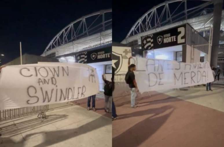 Em protesto pacífico, torcedores levam faixas para o lado de fora do estádio Nilton Santos contra o dono da SAF do clube
