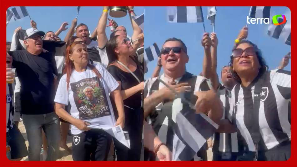Torcida do Botafogo grita ‘é campeão’ e posa ao lado da taça do Mundial em duelo com Palmeiras. Os botafoguenses se reuniram neste sábado, 28, para acompanhar a partida decisiva contra a equipe paulista pelas oitavas de final em Copacabana, no Rio de Janeiro. Nos arredores da praia, os torcedores puderam já posar para uma sessão de fotos ao lado da taça da Copa do Mundo de Clubes. A torcida botafoguense também tinha à disposição as réplicas da Copa Libertadores e do Brasileirão, estas já conquistadas em 2024. Imagens: Jerson Pitta/Redação Terra