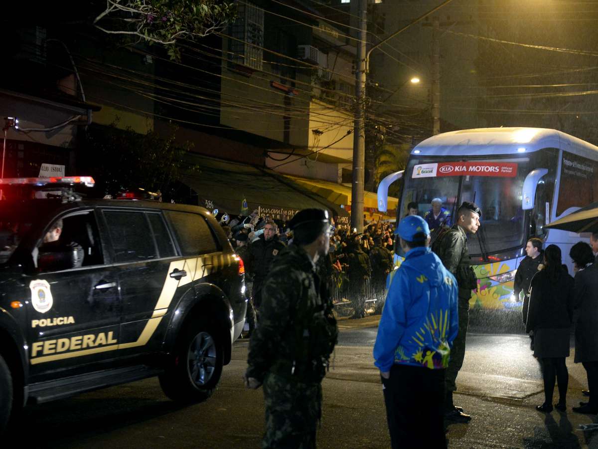 Antes mesmo da chegada do ônibus do Brasil, os arredores do hotel já estavam repletos de policiais militares, membros do Exército e da Companhia de Engenharia de Tráfego (CET)