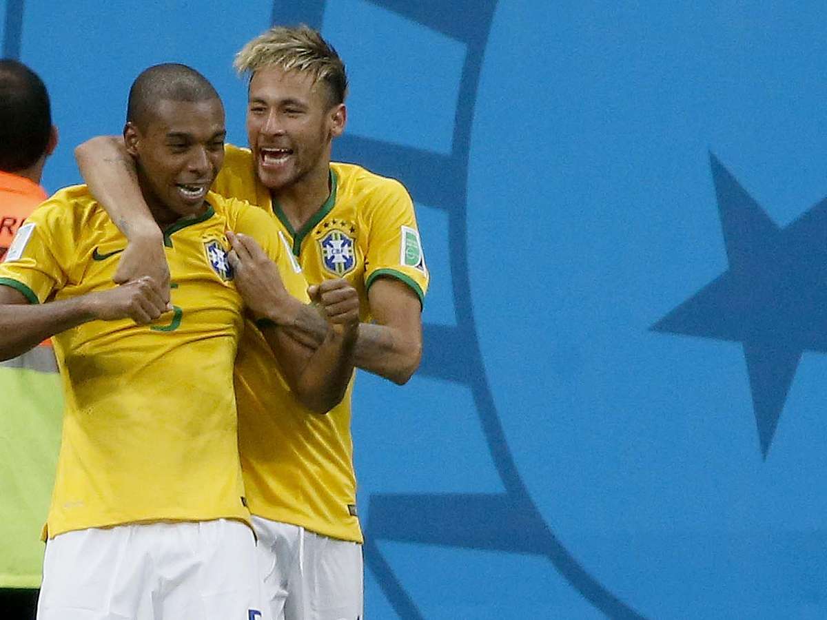 Neymar abraça Fred depois de o camisa 9 marcar de cabeça o terceiro gol do Brasil na partida contra Camarões