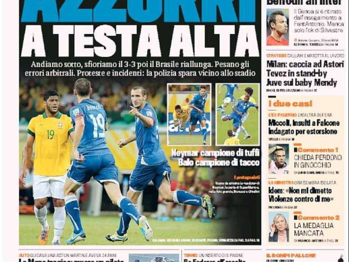 O tradicional jornal italiano La Gazzetta dello Sport não gostou do que viu na partida Itália 2 x 4 Brasil: reclamou da arbitragem, lembrou a ação de policiais nos arredores do estádio, chamou Neymar de "campeão de mergulho" e exaltou Balotelli como "campeão de calcanhar", graças ao belo passe do atacante italiano para o gol de Giaccherini no começo do primeiro tempo