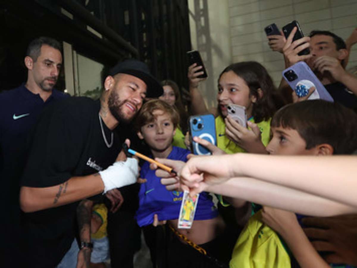 Neymar chegou ao hotel onde a Seleção está hospedada no fim da noite desta segunda. Lá, muitos fãs já o esperavam e ele atendeu a todos com fotos e autógrafos. Ele estava com um curativo na mão direita, apesar de ainda não ter feito sua estreia com a camisa da equipe saudita.