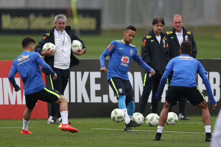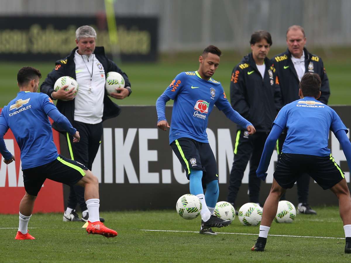 Também arriscou algumas cobranças de falta, próximas à area e sem barreira. Nessas jogadas, os goleiros tiveram um pouco mais de sorte. Enquanto 'abusava' dos reservas, Neymar era observado à distância pelo titular da posição, Fernando Prass, um dos três do grupo com mais de 23 anos, assim como o craque do Barcelona. O outro mais velho é Renato Augusto, que não se apresentou ainda em Teresópolis.