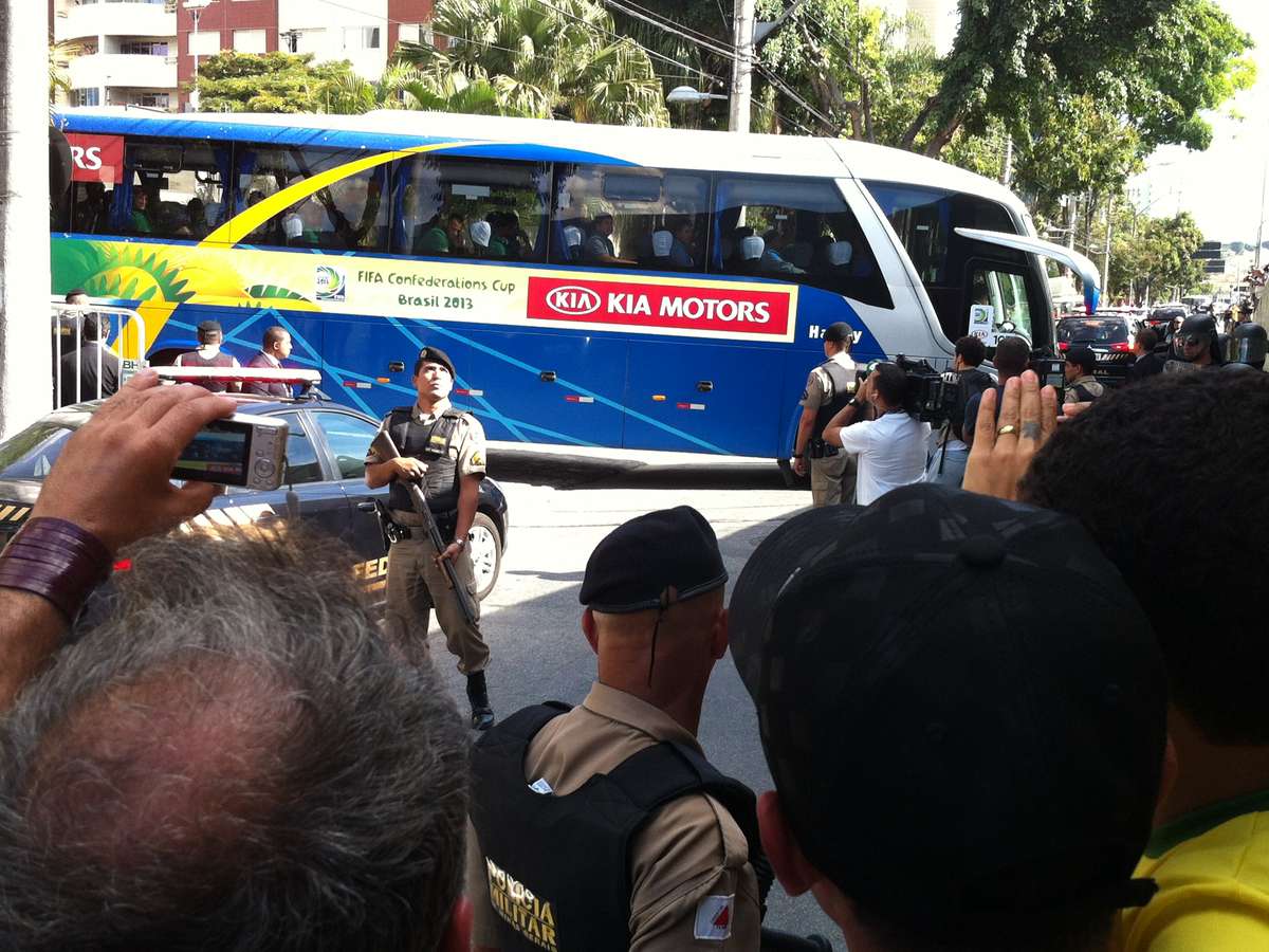 A Seleção Brasileira deixou o hotel onde estava hospedada em Belo Horizonte por volta de 13h50 para a partida desta quarta-feira contra o Uruguai, no Estádio do Mineirão, pelas semifinais da Copa das Confederações. A chegada ao local do jogo aconteceu cerca de 20 minutos depois.