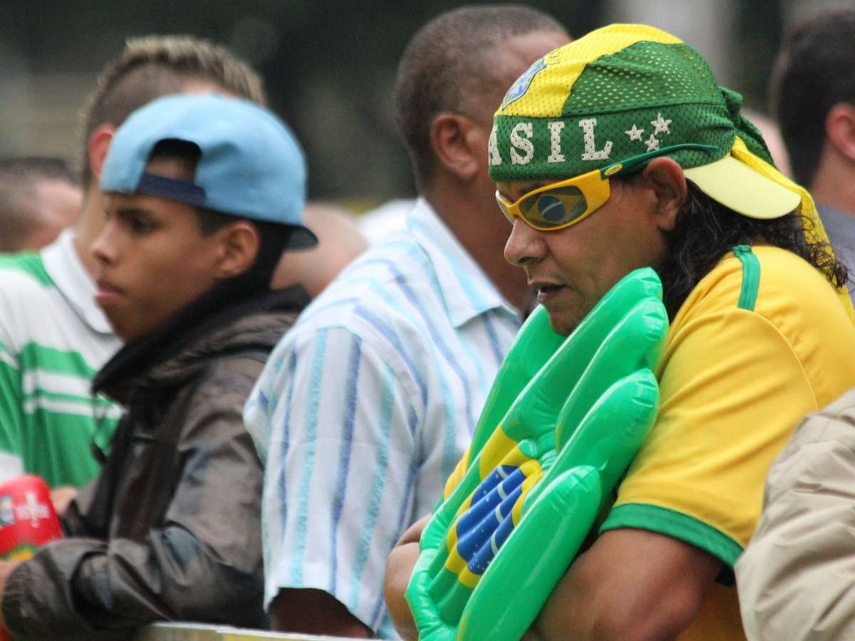Os torcedores compareceram ao local, na região central de São Paulo, usando acessórios verde e amarelo