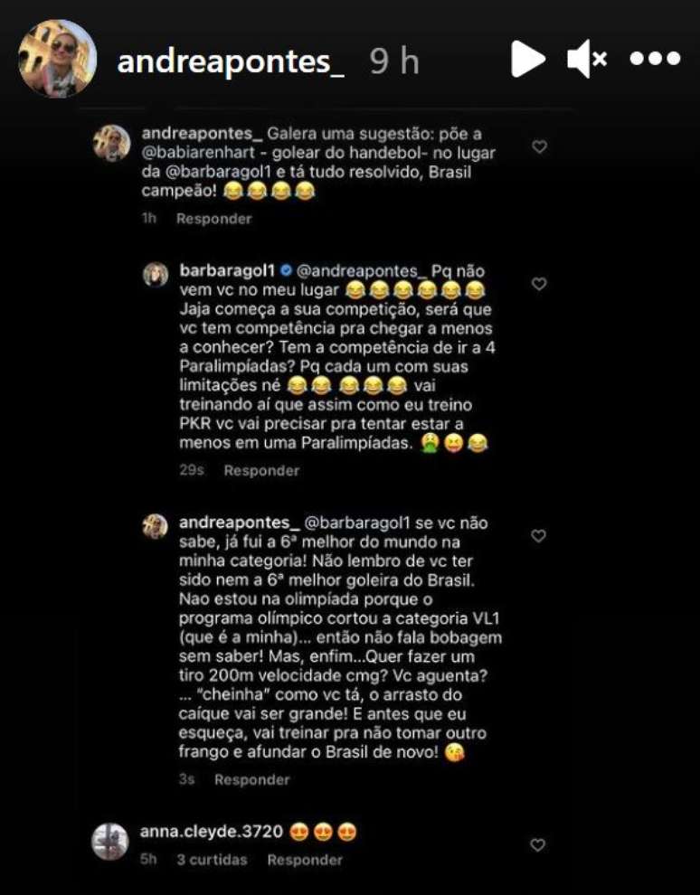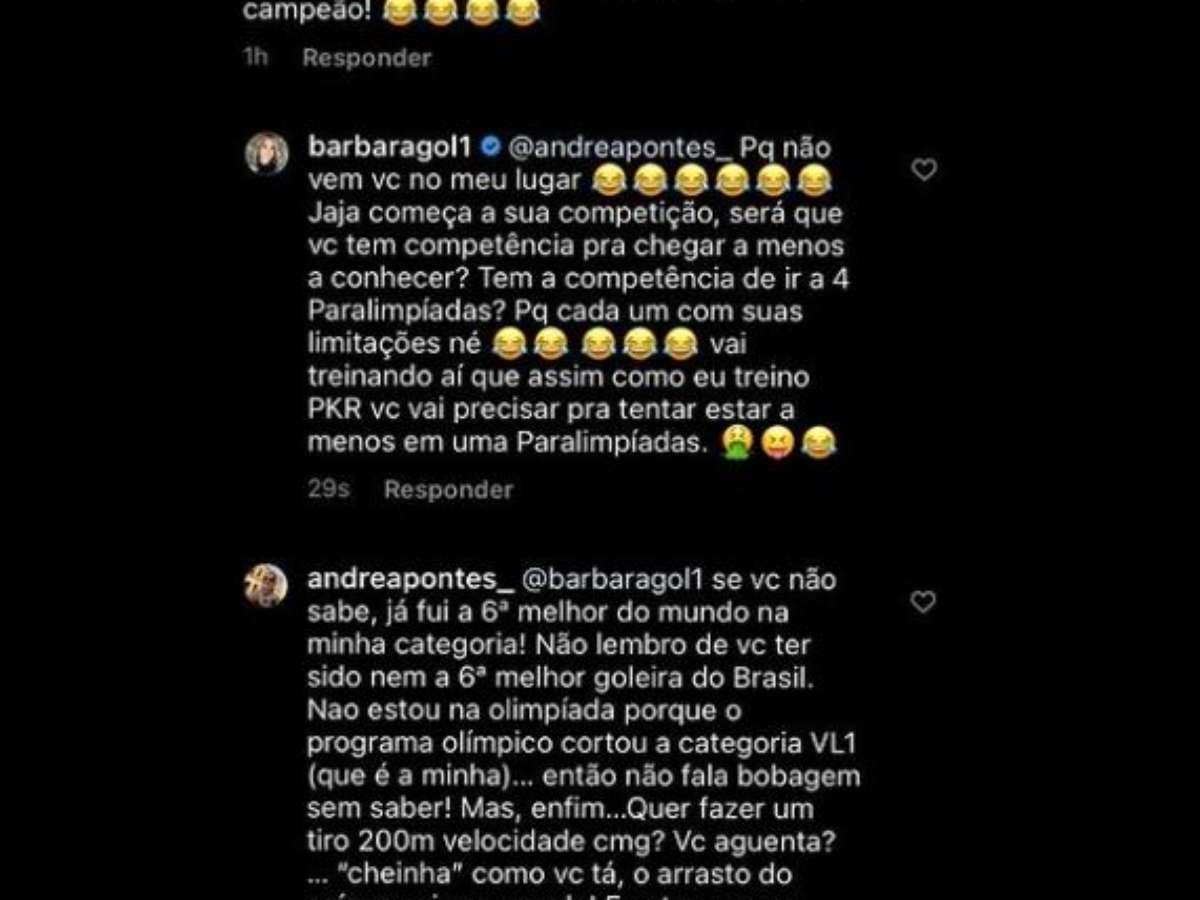 A goleira Bárbara, da Seleção Brasileira, se envolveu em uma confusão nesta quarta-feira em seu Instagram. A jogadora foi ironizada em um comentário pela atleta paralímpica da canoagem Andrea Pontes e respondeu, no que virou uma discussão entre as duas, exposta pela própria Andrea.