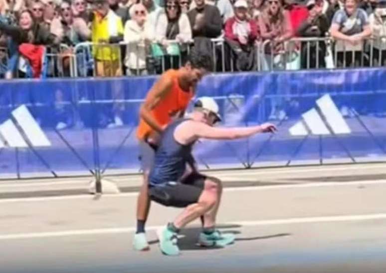Pedro Arieta percebe que o competidor passava por dificuldades para finalizar a prova e o ajuda a chegar a linha de chegada.