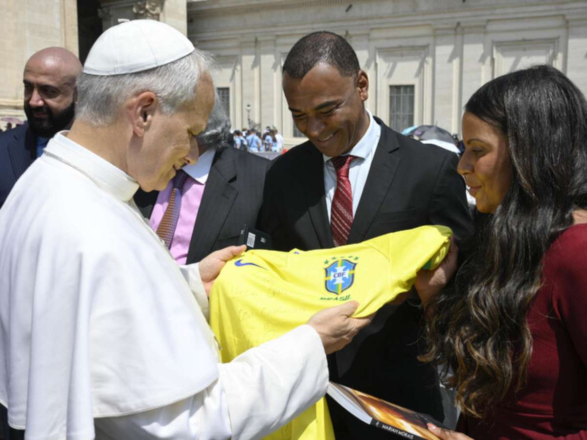 O ex-lateral brasileiro Cafu, capitão do penta em 2002, se encontrou nesta quarta-feira (11) com o papa Leão XIV e presenteou o pontífice com uma camisa da seleção.