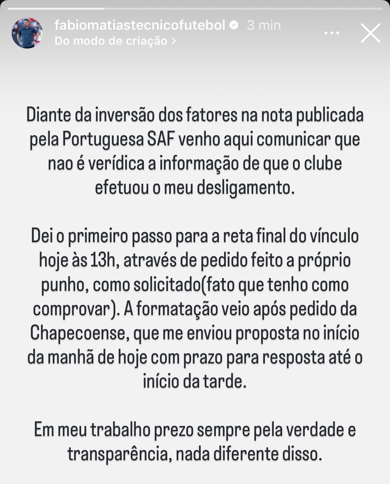 "A Portuguesa SAF comunica o desligamento do técnico Fábio Matias do comando da equipe profissional. A decisão foi tomada após o avanço de negociações do treinador com outro clube. A diretoria entende que o momento exige um profissional com dedicação integral e comprometimento absoluto com o projeto esportivo da Portuguesa. Sob seu comando, a equipe disputou 13 partidas, com 6 vitórias, 3 empates e 4 derrotas. A Portuguesa SAF informa que já iniciou o processo de busca por um novo treinador e espera anunciar em breve o profissional que dará sequência ao planejamento da temporada", escreveu a Portuguesa.