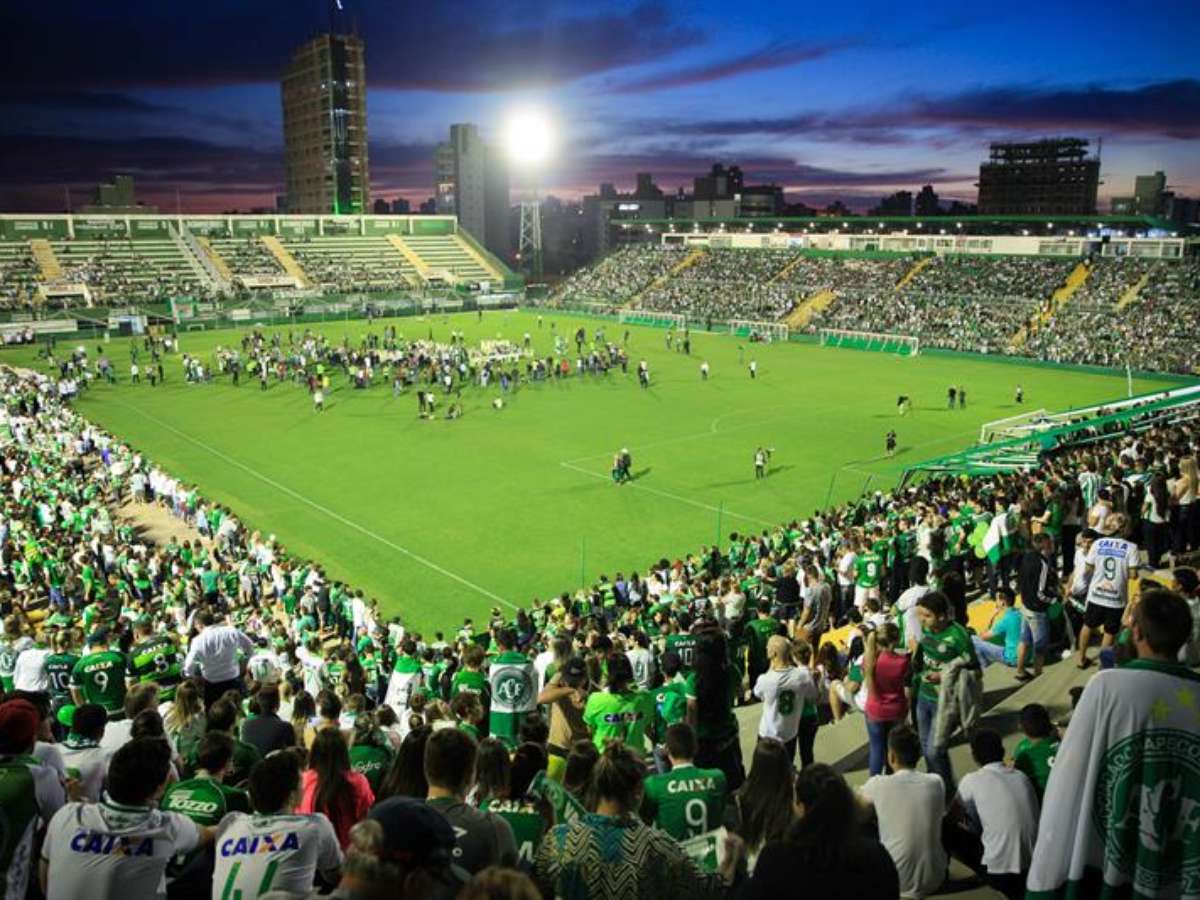 Milhares de torcedores lotaram a Arena Condá, em Chapecó (SC), em noite de emocionante homangem nesta quarta-feira (30), no horário em que a Chapecoense enfrentaria o Atlético Nacional, da Colômbia, pela final da Copa Sul-americana