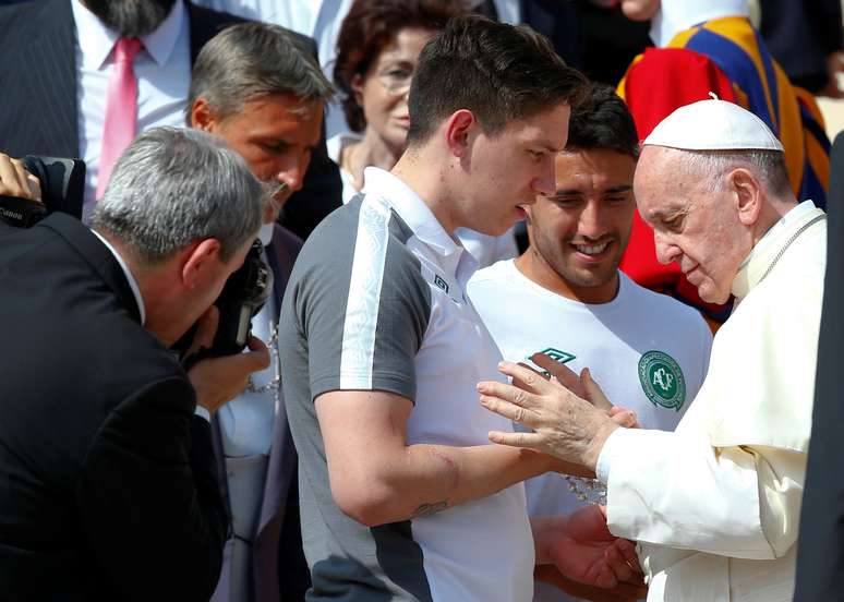 A delegação da Chapecoense está na Itália para um amistoso contra a Roma e, nesta quarta-feira, teve um encontro com o Papa Francisco, no Vaticano. Os jogadores, incluindo os sobreviventes da tragédia aérea Alan Ruschel e Jakson Follmann, foram recebidos e agraciados em uma audiência geral na Praça São Pedro, na sede mundial da Igreja Católica.