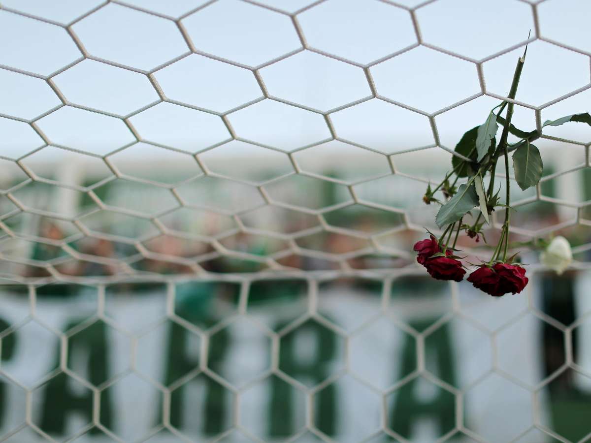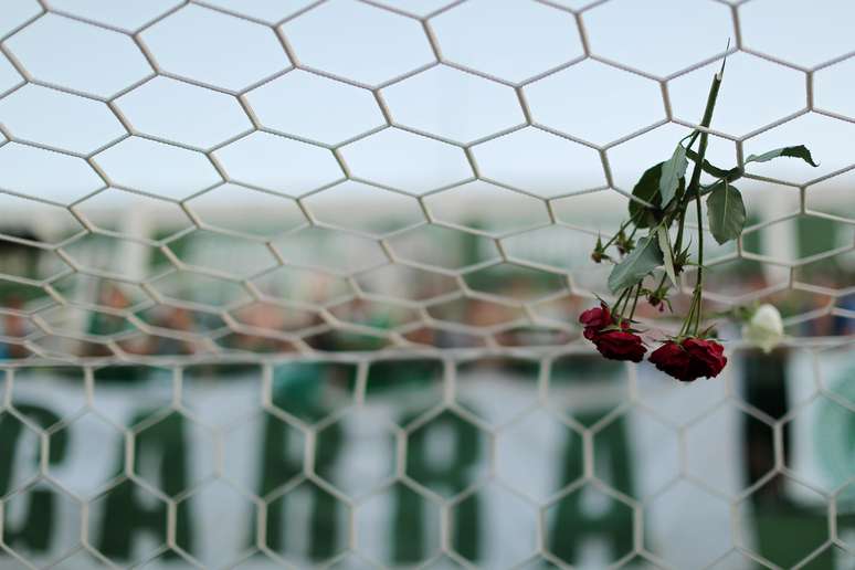 Rosa é deixada sobre rede de gol da Arena Condá em homenagem à Chapecoense