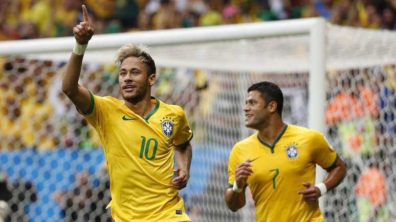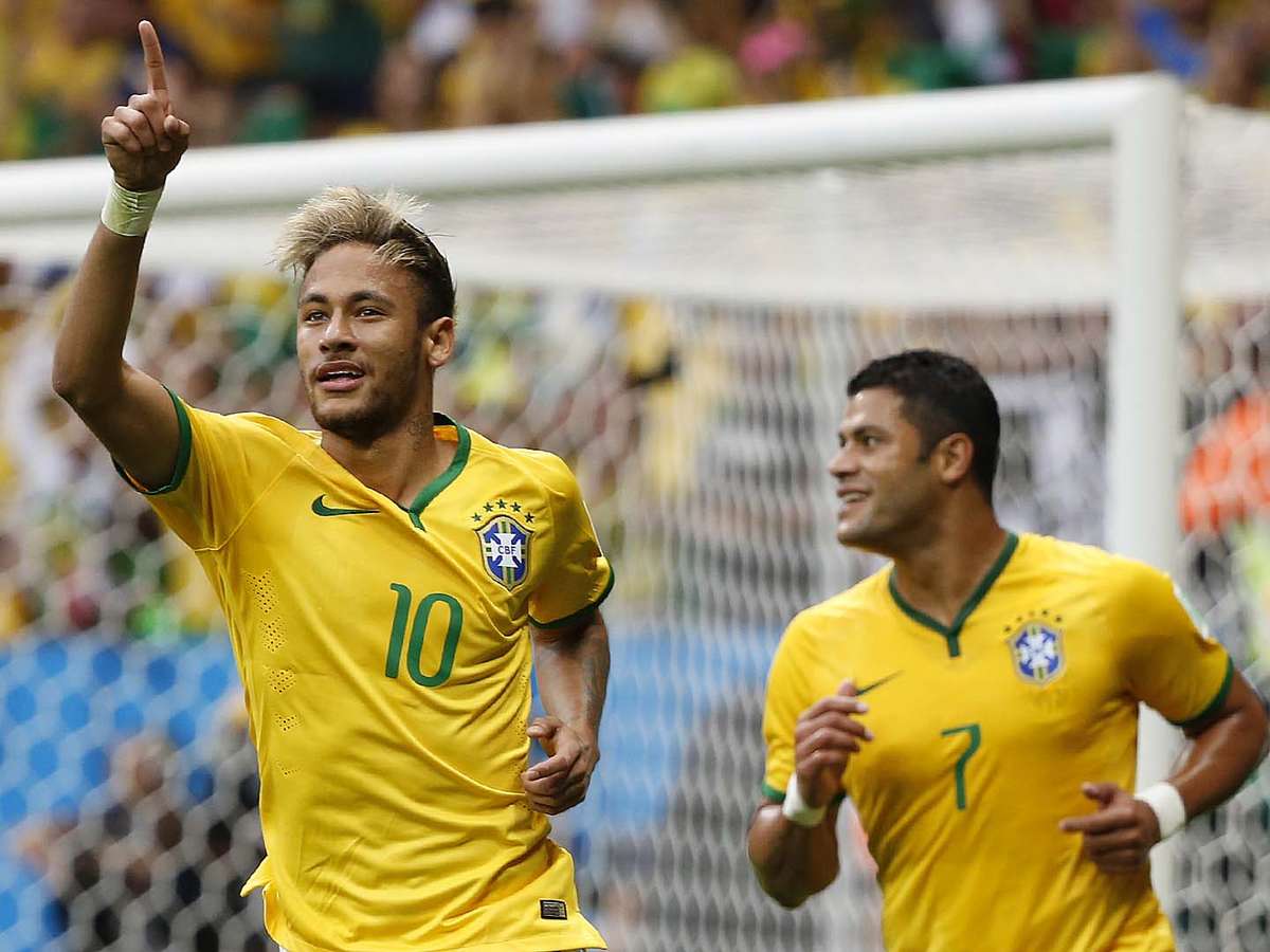 Após bela jogada de Luiz Gustavo pela esquerda, Neymar recebe cruzamento e chuta no canto para abrir o placar para o Brasil no jogo contra Camarões. O gol do camisa 10, marcado na centésima partida da Seleção em Copas do Mundo, foi também o 100º desta edição do Mundial