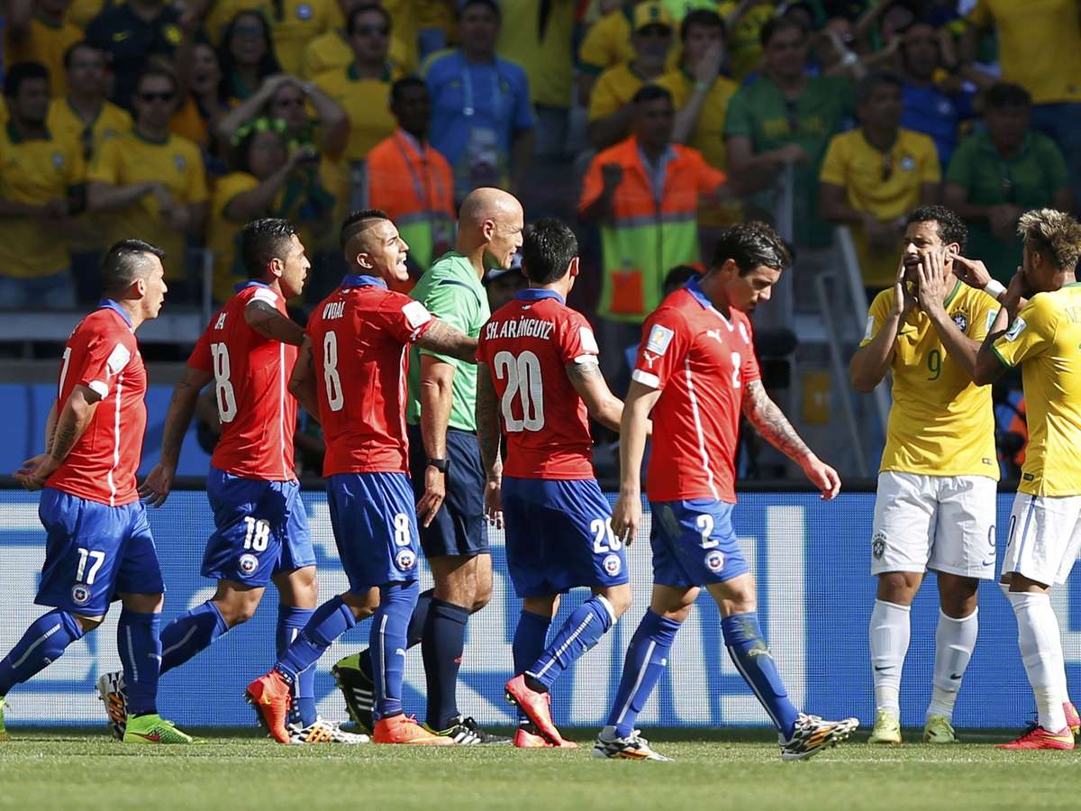 Mena marca Daniel Alves durante jogo entre Brasil e Chile
