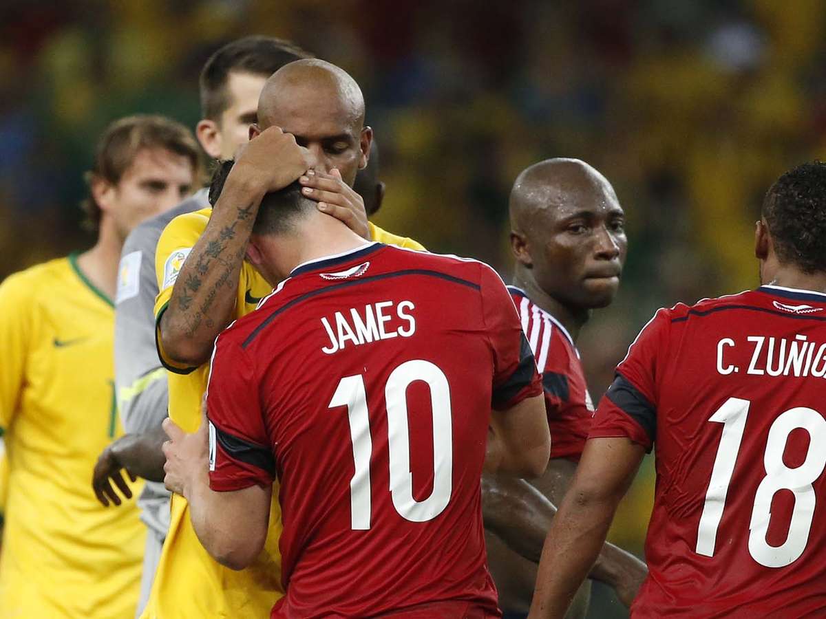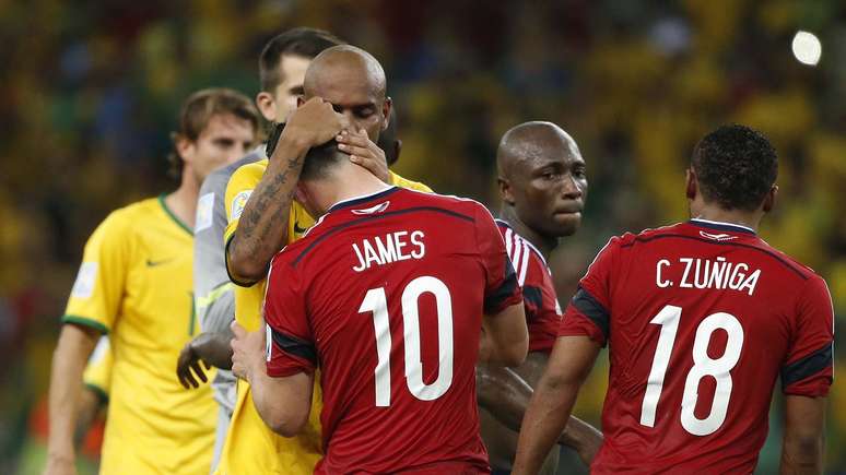 Festa de um lado, tristeza do outro. Após a vitória brasileira por 2 a 1 na Arena Castelão, em Fortaleza, a Seleção comemora em campo a vaga na semifinal, enquanto os jogadores colombianos se despedem com sofrimento da Copa do Mundo