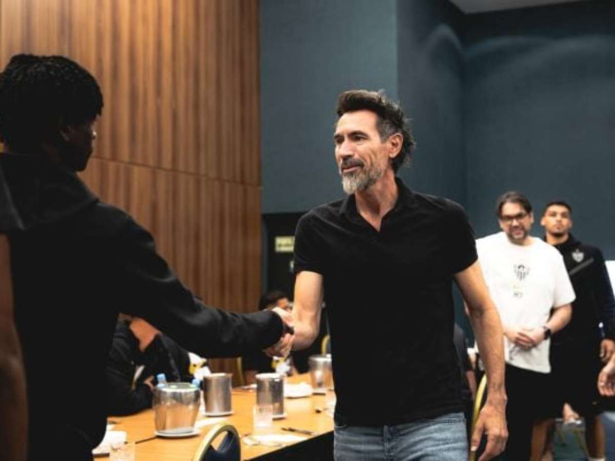 Sem muitos alardes, pediu licença e disse que falaria em espanhol, mas que, aos poucos, tentará falar mais em português. Respondeu com respeito, disse que quer aproveitar o que tem, que está aqui para treinar e potencializar o vestiário.