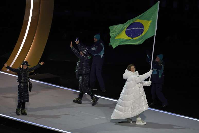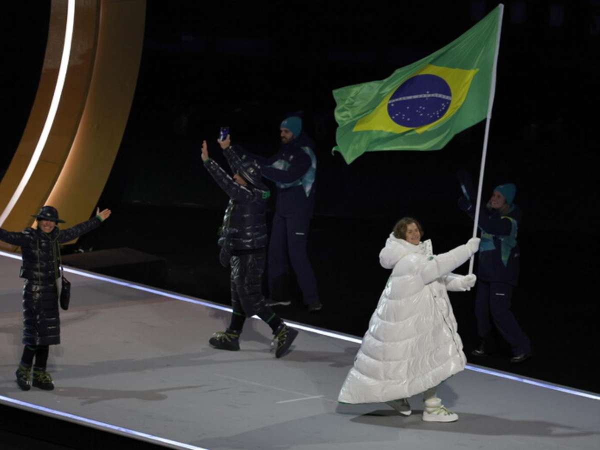 Os atletas Lucas Pinheiro Braathen e Nicole Silveira carregaram, nesta sexta-feira (6), a bandeira do Brasil durante a animada entrada da delegação brasileira na cerimônia de abertura dos Jogos Olímpicos de Inverno de Milão e Cortina d'Ampezzo, na Itália.