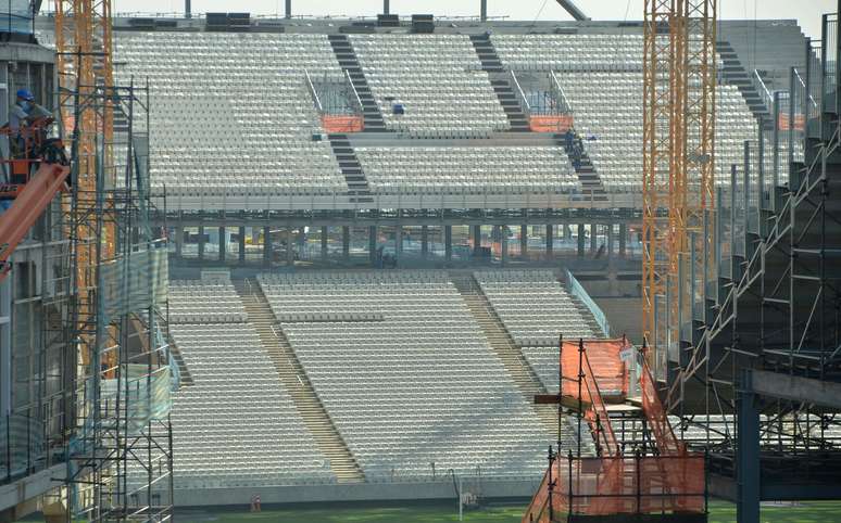 As obras para instalação das arquibancadas móveis na Arena Corinthians foram retomadas nesta terça-feira, após o Ministério do Trabalho e Emprego ter dado a liberação na última segunda