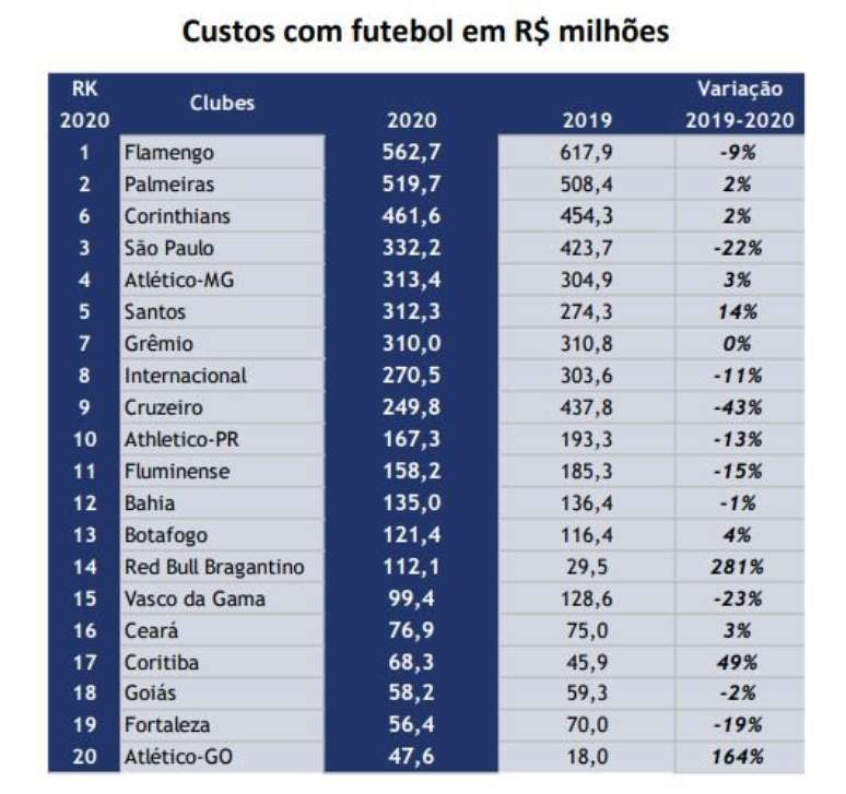 Os top 20 clubes, que geraram a maior receita da história em 2019, R$ 6,1 bilhões, viram o valor cair para R$ 5,1 bilhão em 2020. A redução, aliás, só não foi maior porque muitos clubes cresceram em receitas com transferências, o que amenizou os impactos. As receitas com transferências somaram R$ 1,6 bilhão em 2019, valor recorde, enquanto em 2020 chegaram a R$ 1,5 bilhão (tombo de 5,6%).