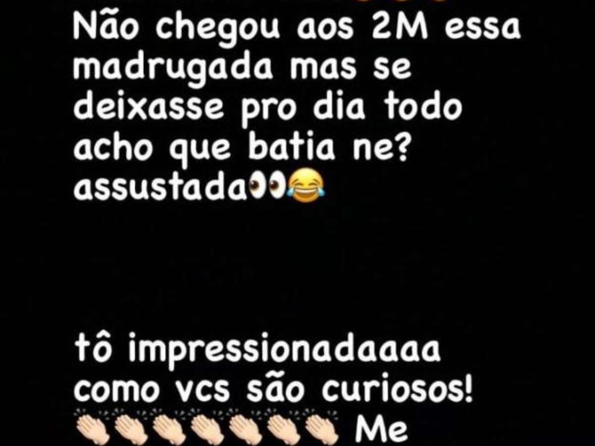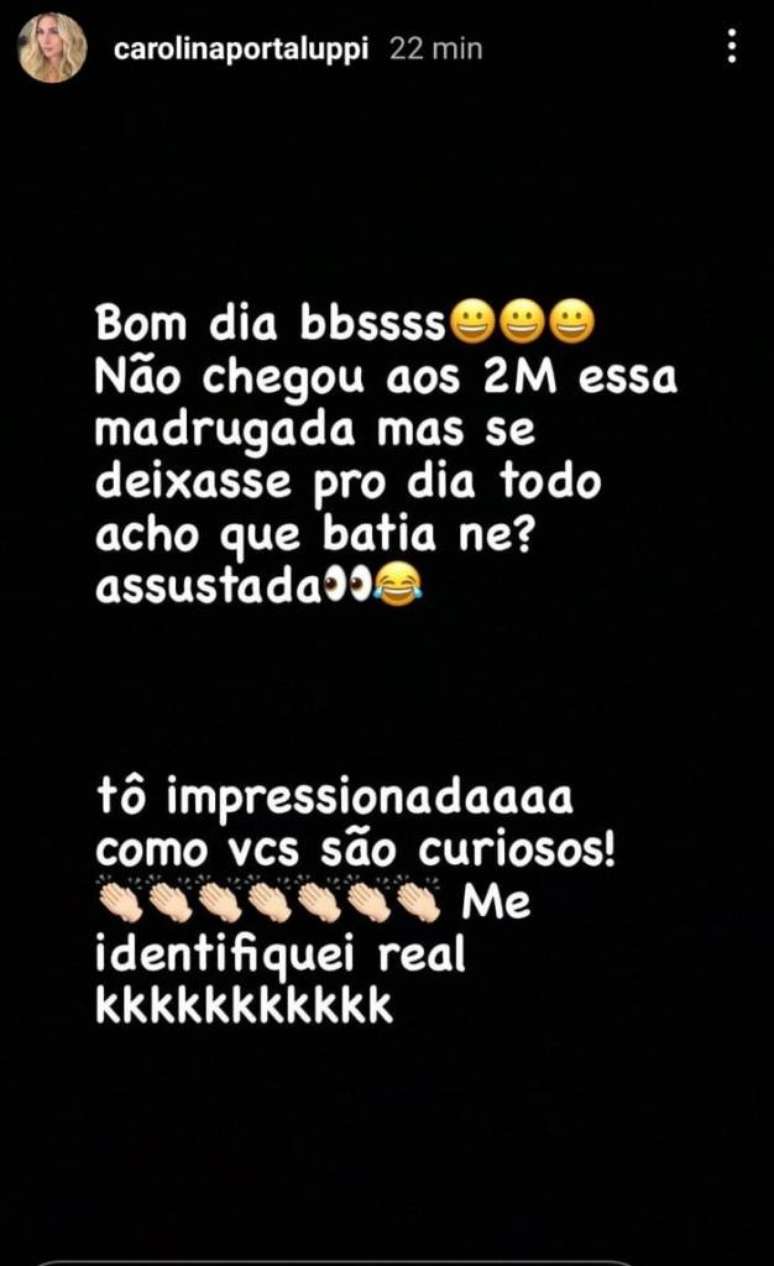 "Não chegou aos 2 milhões essa madrugada mas se deixasse para o dia todo acho que batia, né? Assustada. Estou impressionada como vocês são curiosos! Me identifiquei real", disse Carol.