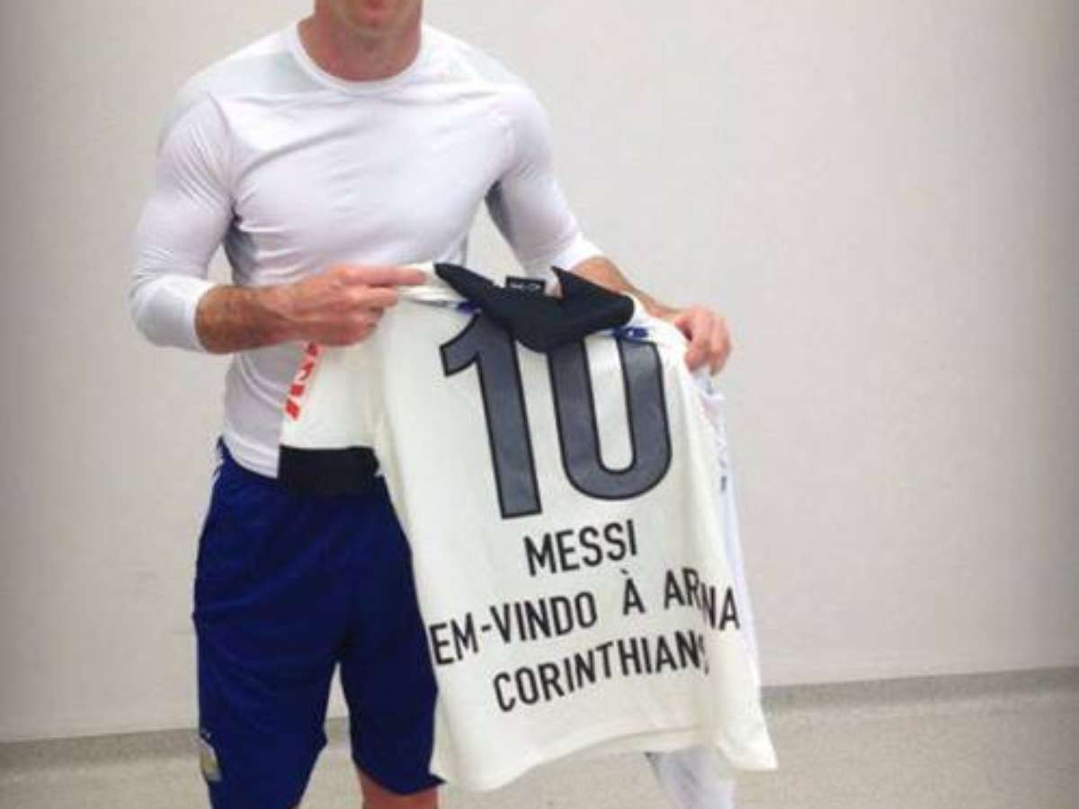 Depois de um treinamento leve de reconhecimento do gramado na Arena Corinthians nesta segunda-feira, Lionel Messi posou para foto com a camisa do clube anfitrião. Além do número 10 às costas, o presente entregue ao jogador da Argentina tinha uma mensagem de boas vindas. Messi e os argentinos atuam em São Paulo contra a Suíça, na terça, pelas oitavas de final da Copa do Mundo.