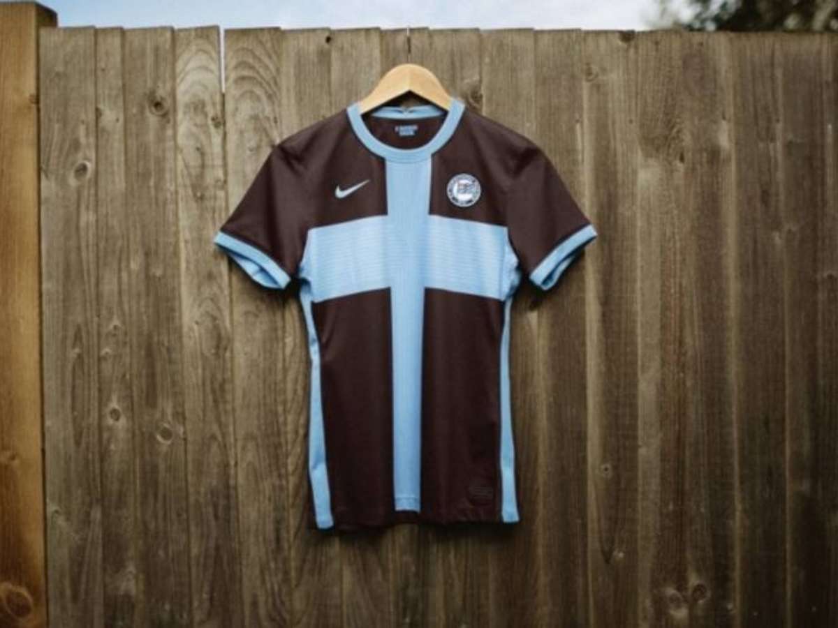 A nova camisa é predominantemente marrom com detalhes em azul claro, com o escudo usado entre 1919 e 1939. Uma grande cruz percorre toda a peça, uma inspiração no tradicional desenho da bandeira da Inglaterra que simboliza São Jorge, o padroeiro do país. A gola careca segue a mesma tonalidade dos detalhes nas mangas.