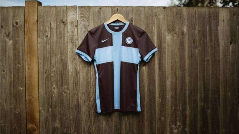 Nova camisa é marrom com uma cruz azul-claro na frente, inspirada em São Jorge