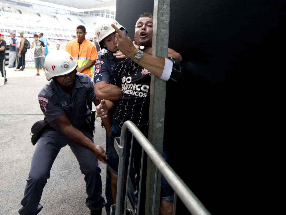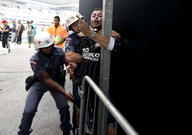 Torcedor corintiano foi expulso pela PM ao tentar pular catracar para entrar no jogo contra o Figueirense, na Arena Corinthians