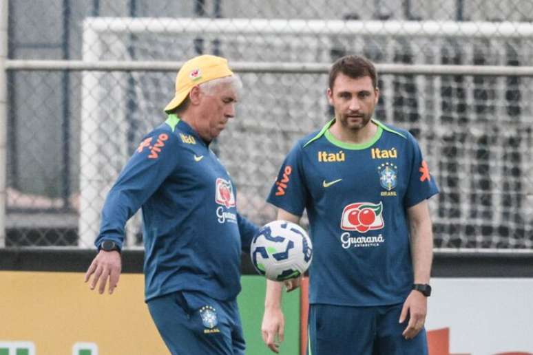 O treino da seleção brasileira, neste sábado, contou com uma breve presença do técnico Dorival Júnior, que comandou a equipe no último ano. Atualmente no Corinthians, o ex-comandante posou ao lado de Carlo Ancelotti, que comandou as atividades no CT do clube paulista.