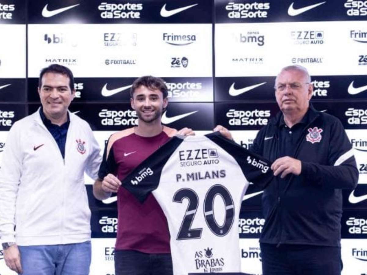 Depois do anúncio oficial no decorrer da semana, o lateral-direito Pedro Milans foi apresentado neste sábado (24) no CT Dr. Joaquim Grava. Ao lado do presidente Osmar Stabile e do executivo de futebol Marcelo Paz, o uruguaio de 23 anos assinou contrato com o clube paulista até dezembro de 2029. Na apresentação, aliás, ele contou o motivo pelo qual escolheu defender o Timão.