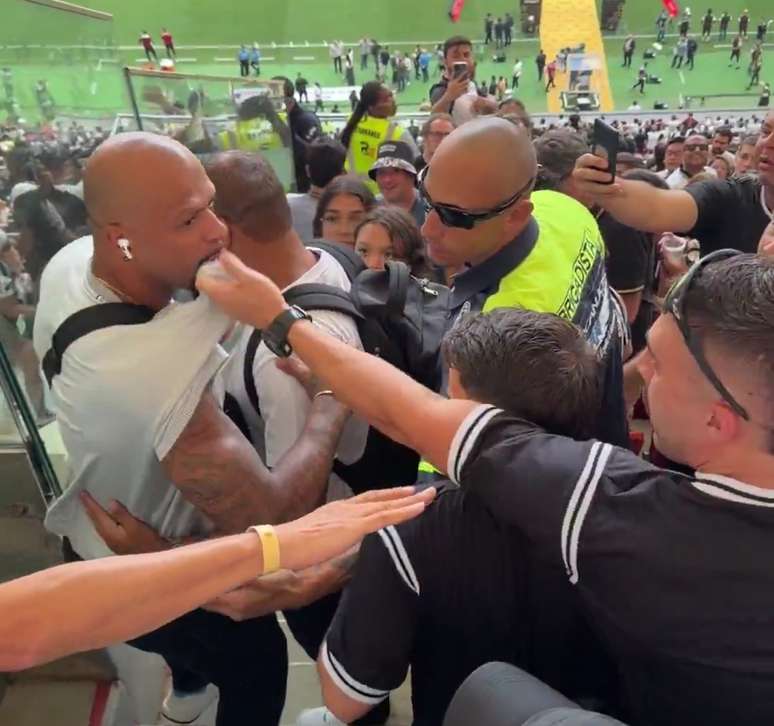 Na sequência, um homem chega a dar um tapa e a segurar a camisa de Felipe Melo, enquanto profere xingamentos ao ex-jogador. Um brigadista intervém e ajuda a separar a confusão. Após o ocorrido, o ex-atleta desce as escadas do estádio.